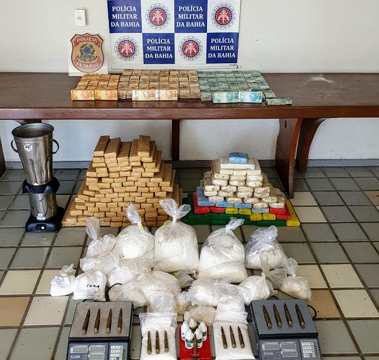 Na manhã de 04/09/20, uma ação conjunta entre as Polícias Federal e Militar resultou na apreensão de grande quantidade de dinheiro e drogas, além de munições e explosivos na cidade de Porto Seguro. Foram encontrados: R$ 740 mil em espécie; 93,377 kg de maconha; 26,647 kg de cocaína; 20,095 kg de crack; 40 kg de mistura para preparo de cocaína; 01 emulsão explosiva pesando 1,5 kg; 20 metros de cordel detonante; 15 munições calibre .50; 100 espoletas; 02 balanças comuns; 01 balança de precisão; 01 liquidificador industrial e 06 frascos de amônia.