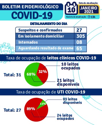 Em 10/01 foram confirmados 27 novos da Covid-19. Oito pessoas estão internadas. Dos 31 leitos clínicos, 10 estão ocupados. Dos 27 leitos UTI, três estão disponíveis. De acordo com o boletim, há 305 casos em isolamento domiciliar. Estes são casos monitorados com teste positivo acrescidos dos casos suspeitos do dia. 65 pessoas aguardam resultado de exame.