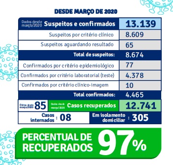 Segundo o boletim, que, desde a posse da nova gestão tem enfatizado também os casos suspeitos, antes considerados apenas como pacientes com síndrome gripal, em 10/01, a cidade registrou 12.741 pessoas recuperadas, totalizando um percentual de 97% entre os suspeitos e confirmados de Covid-19. 85 óbitos foram registrados desde março/2020. O 85º óbito foi de um homem de 61 anos, portador de comorbidades, residente do bairro Vila Jardim.