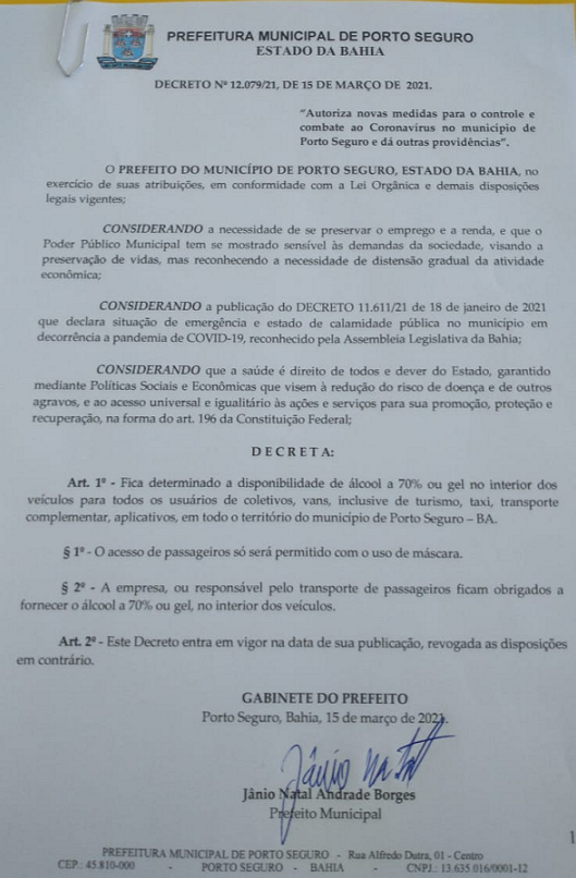 O decreto municipal nº 12.079, de 15/03/21, determina novas regras sanitárias para uso de transportes em Porto Seguro. Os meios de transportes (coletivos, vans, inclusive de turismo, táxi, transporte complementar, por aplicativos, deverão disponibilizar álcool em gel para os passageiros, que deverão usar máscaras ao entrarem no veículos.