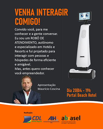 As possibilidades de um robô auxiliar na prestação de serviços no ramo turístico vão ser apresentadas na palestra Venha Interagir Comigo. Promovida pela CDL, ABIH e ABRASEL de Porto Seguro, os palestrantes serão o empresário Maurício Coscina e o robô funcionário idealizado e construído por ele.