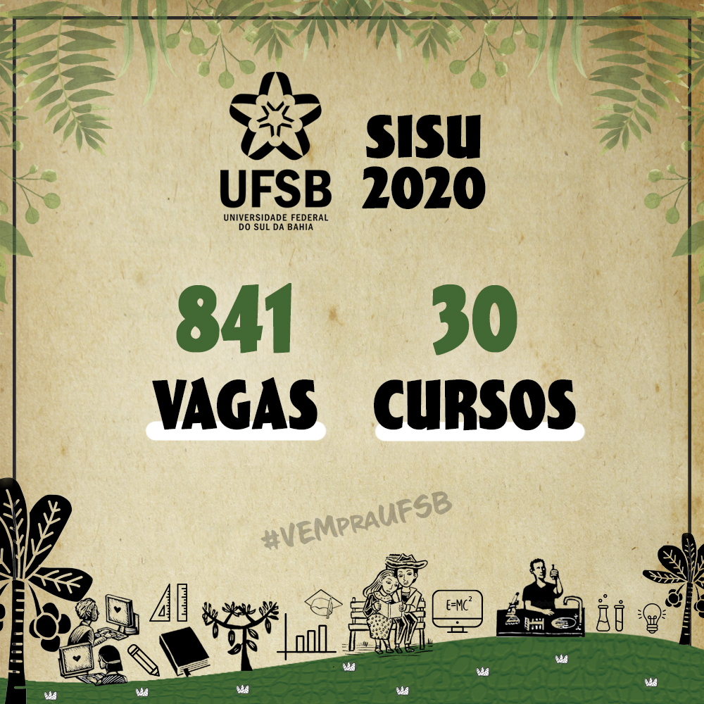 A Universidade Federal do Sul da Bahia (UFSB) definiu a oferta de 841 vagas para a edição 2020 do Sistema de Seleção Unificada, o Sisu. São 30 cursos diferentes de graduação nos campi Jorge Amado (Itabuna), Paulo Freire (Teixeira de Freitas) e Sosígenes Costa (Porto Seguro). As inscrições poderão ser feitas no site do Sisu no período entre 21 e 24 de janeiro de 2020, requerendo as notas obtidas no Exame Nacional do Ensino Médio (Enem) de 2019. No sistema, basta buscar pela sigla “UFSB” e pelo campus ou curso de interesse. Quem conquistar uma vaga começará a estudar na UFSB no dia 1º de junho de 2020, como definido no Calendário Acadêmico institucional.