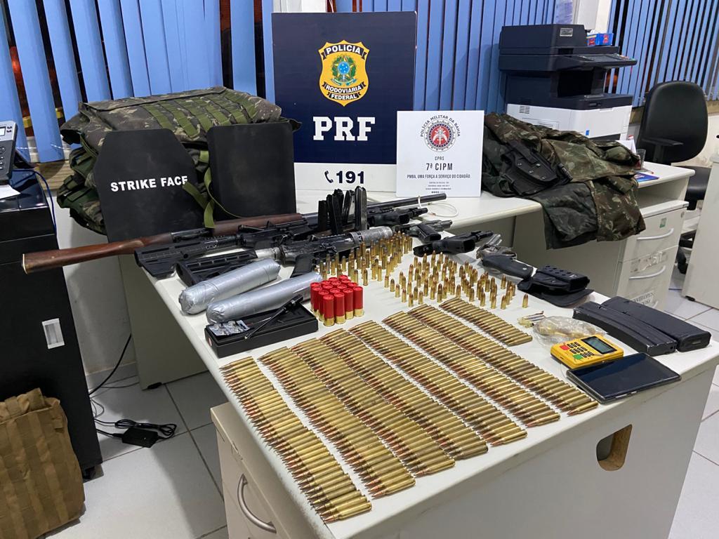 Quando as equipes policiais alcançaram o veículo, realizaram abordagem e encontraram as armas: um fuzil calibre 5.56; uma submetralhadora e duas pistolas calibre 9 mm cada; um revólver calibre 38; 1 pistola calibre 380; uma espingarda calibre 12 e 5 coletes balísticos. Já as munições foram 298 munições de calibre 5.56, 50 munições de calibre .38, 50 munições de calibre 9 mm, 16 munições de calibre 12, 27 munições de calibre 380, além dos dois volumes de emulsão explosiva, quatro espoletas e um cordel detonante.
