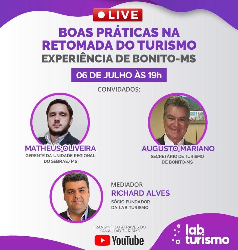 Para abordar esses assuntos Richard Alves, sócio fundador da Lab Turismo, conversará com Augusto Mariano, secretário de turismo de Bonito, e com Matheus Oliveira, gerente regional do Sebrae. A live será no dia 06/07/20 (segunda-feira) às 19h00 (horário de Brasília), transmitida pelo canal no YouTube da Lab Turismo.