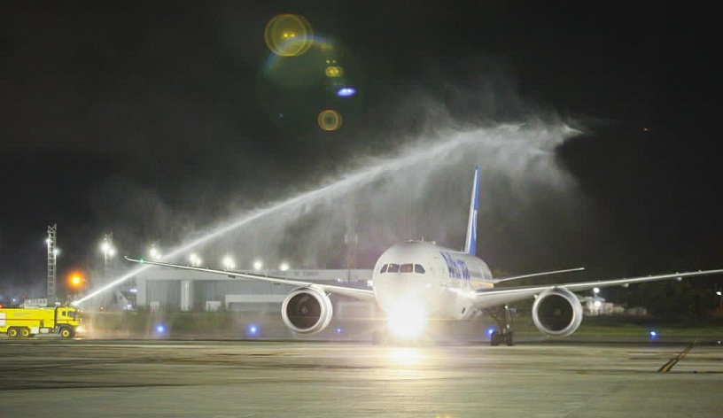Logo após o pouso, o avião passou pela tradicional cerimônia de batismo e os passageiros foram recepcionados com uma festa de boas-vindas com a presença de baianas e música, seguindo as regras de distanciamento social e demais protocolos de segurança.