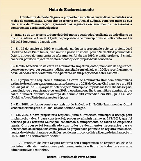 O comunicado afirma que o terreno teria sido doado em regime de aforamento pelo ex-prefeito José Ubaldino Alves Pinto Júnior, a Teófilo Epaminondas Ottoni, que, em 2018, teria vendido o terreno a Luís Fabiano Santana Vargas. Ainda, segundo o comunicado, em 2019, Luís Fabiano requereu junto a prefeitura, alvará para construção, o que foi deferido, "constatado o cumprimento das exigências legais”.