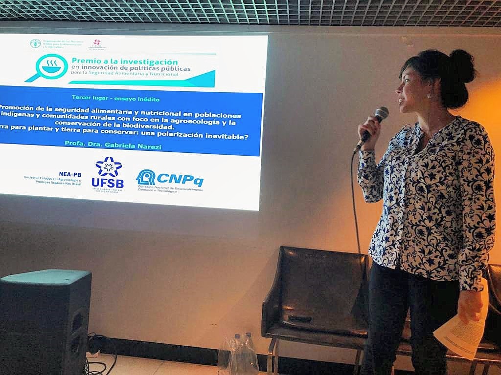 A professora Gabriela Narezi, docente do Centro de Formação em Ciências Ambientais (CFCAm) e coordenadora do Núcleo de Estudos em Agroecologia e Produção Orgânica Pau Brasil (NEA-PB), do Campus Sosígenes Costa (Porto Seguro), participou da cerimônia de recebimento do Premio a la investigación en innovación de políticas públicas en Seguridad Alimentaria y Nutricional, convocado pelo Escritório Regional para América Latina e Caribe da Organização das Nações Unidas para Alimentação e Agricultura (FAO).