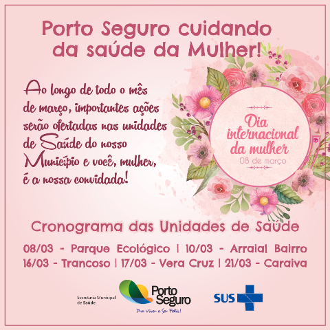 A Secretaria de Saúde de Porto Seguro preparou uma programação em alusão ao Dia Internacional da Mulher, comemorado dia 8 de março. O cronograma estratégico, que será realizado nas unidades de saúde da família nos bairros e distritos, contará com serviços, ações educativas e preventivas, com disponibilidade de equipe multidisciplinar de especialistas, tendo a finalidade de mobilizar o segmento feminino sobre a manutenção dos cuidados necessários com a saúde.