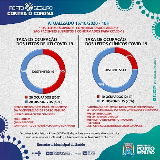 Porto Seguro registrou o 59º óbito por Covid-19, em 15/10/20, desde o início da pandemia. Trata-se de uma mulher de 40 anos de idade, residente do bairro Parque Ecológico, com comorbidades, que foi a óbito em 14/10.