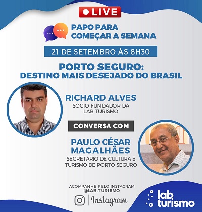 Richard Alves, sócio fundador da Lab Turismo, conversa com Paulo César Magalhães, secretário de Cultura e Turismo de Porto Seguro, no Papo para começar a semana. Na live, dia 21/09/20 às 8h30, eles vão falar sobre como funciona o modelo do Conselho de Turismo, Fundo Municipal de Turismo e ações estratégicas de melhoria da oferta e promoção turística. Tudo sob a luz do tema: “Porto Seguro: o destino mais desejado do Brasil”.