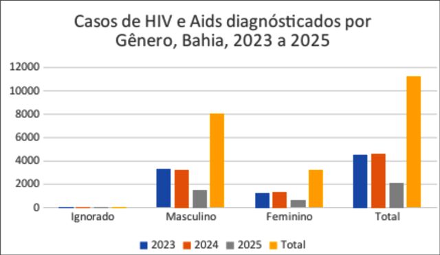 Considerando todas as idades, na Bahia, de janeiro de 2023 a 02 de agosto de 2025, foram diagnosticados 11.187 casos de HIV e Aids; 8.005 (72%) no gênero masculino, 3.164 (28%) no gênero feminino e 18 casos com gênero não afirmado.