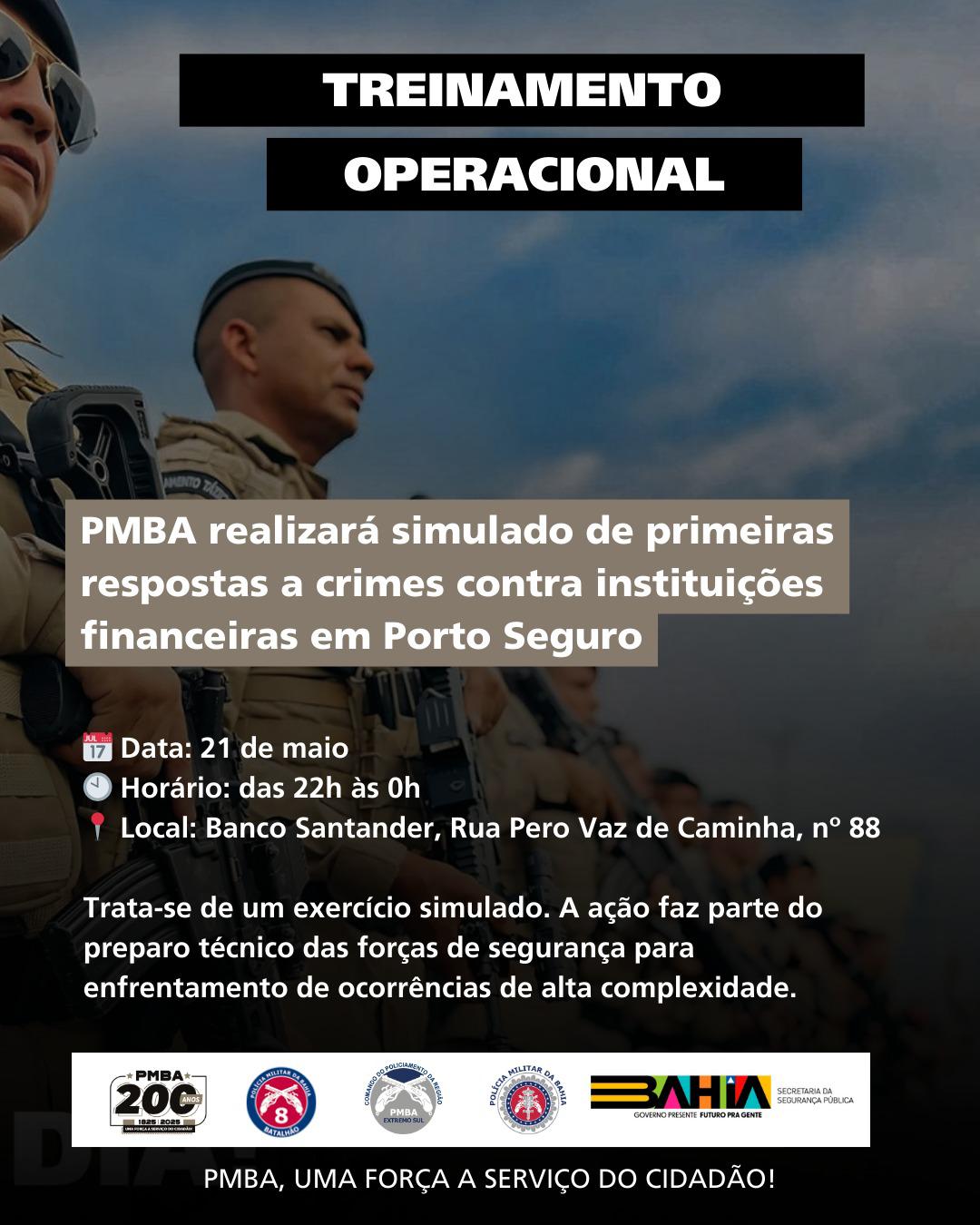 A Polícia Militar da Bahia (PMBa) realizará uma simulação de ataque a uma instituição financeira no Centro de Porto Seguro, na noite de quarta-feira, 21 de maio. A ação, que faz parte de um treinamento estratégico da corporação, está prevista para …