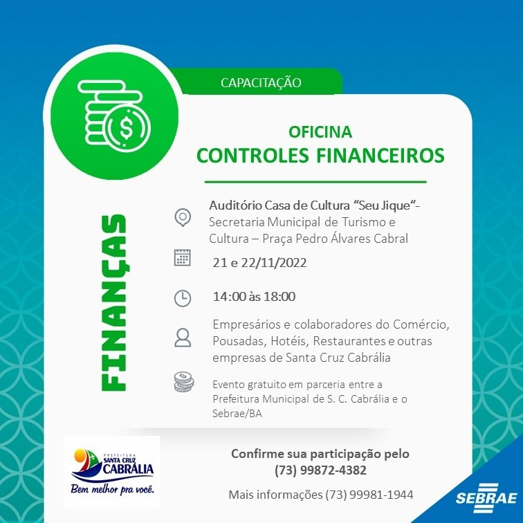 Esta Oficina é oferecida pela Prefeitura Municipal de Santa Cruz de Cabrália, por meio da Secretaria de Turismo, em parceria com o Sebrae/BA.