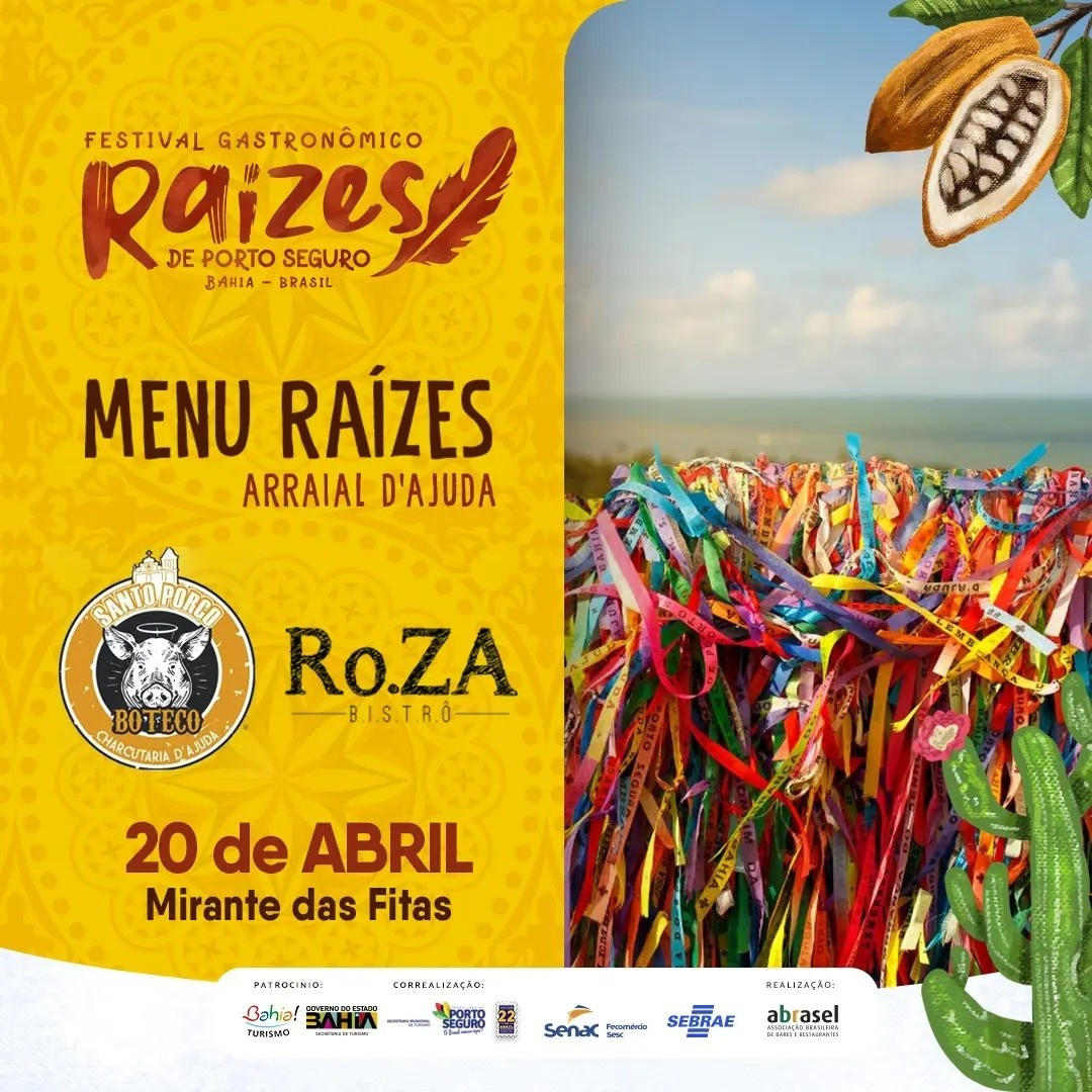 Segunda realização do “Menu Raízes”, agora no Arraial d´Ajuda, com a participação do Boteco Santo Porco, na rua Bela Vista; e Ro.Za Bistrô, na praça Brigadeiro Eduardo Gomes (praça da Igreja)