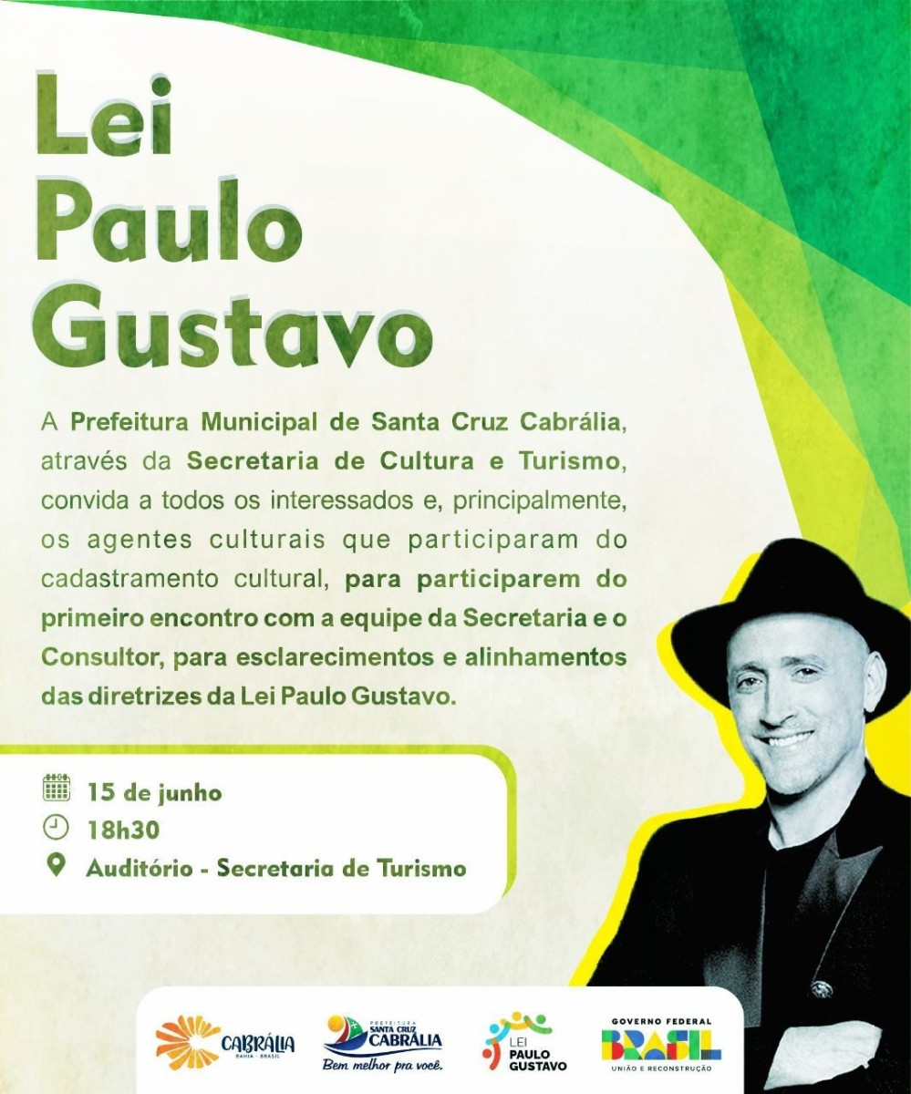 LEI PAULO GUSTAVO - Incentivo financeiro para os fazedores de cultura. Você, agente cultural local no município de Santa Cruz Cabrália, temos um encontro marcado para esclarecimentos e alinhamento das diretrizes da Lei Paulo Gustavo. PROGRAME-SE!