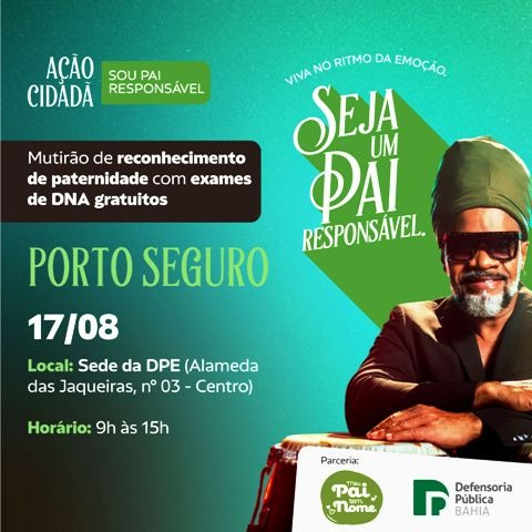 A Defensoria Pública do Estado da Bahia está promovendo a tradicional “Ação Cidadã Sou Pai Responsável”. Em Porto Seguro, a DPE/BA realiza no sábado, 17/08, um mutirão de exames de DNA. A iniciativa também oferece assistência jurídica e psicossocial às famílias, além de acordos e conciliações.