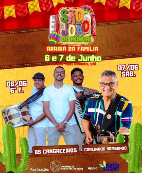Música do vivo com Os Gangaceiros e Carlinhos Bombordo, quermesse, quadrilha, pintura facial, bingo e muita diversão