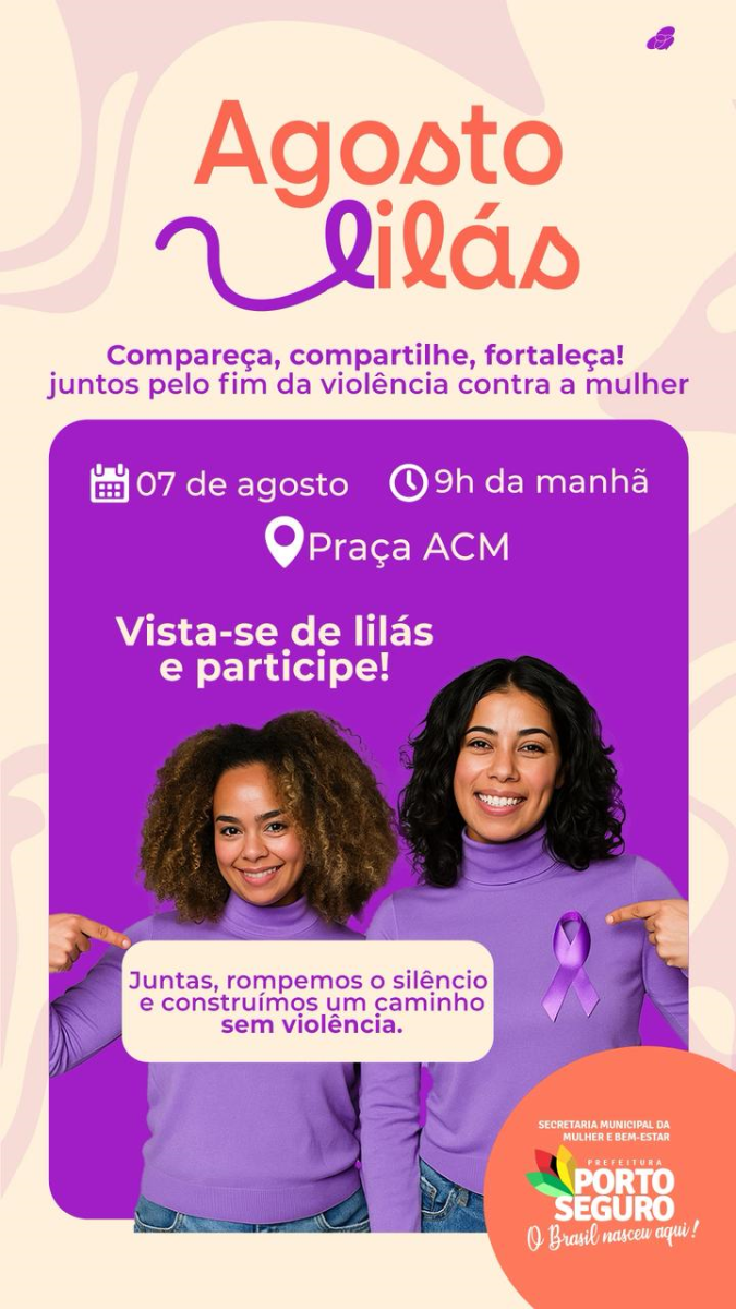 No dia 07/08, a Lei Maria da Penha completa 19 anos. Para marcar essa data tão importante, a Prefeitura de Porto Seguro, por meio da Secretaria de Políticas Públicas para Mulheres e Bem-Estar, convida a população para uma ação especial.