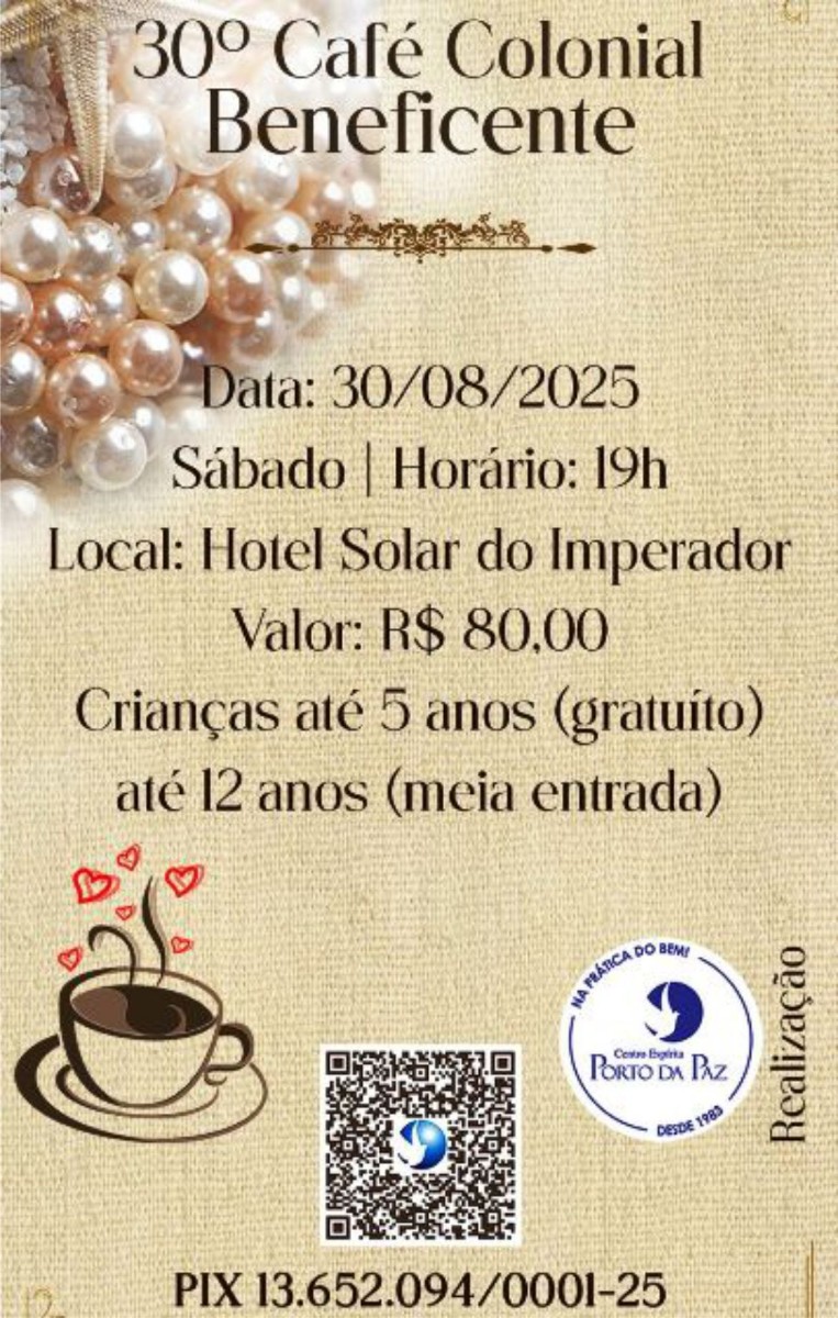 Dia 30/08, sábado, às 19h, no Hotel Solar do Imperador