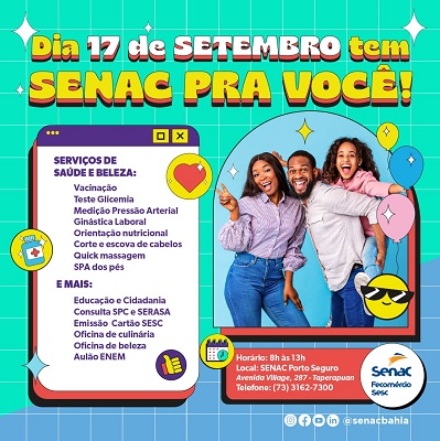 Segundo o Coordenador de Eventos do SENAC Porto Seguro, Bruno Antunes Fernandes, essa é também uma forma de aproximar a entidade da comunidade de Porto Seguro e região. “Ficamos 2 anos sem fazer este evento por conta da pandemia. No dia todas as pessoas interessadas em ter acesso gratuito a serviços de saúde, cidadania, educação e lazer, podem participar, basta se dirigir à unidade de Porto Seguro”, explicou, informando que a expectativa é realizar cerca de 500 atendimentos.