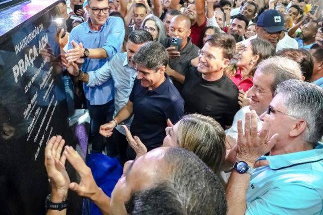 Na praça, ACM Neto acompanhou emocionado o descerramento do busto de Antônio Carlos Magalhães e a realização de uma homenagem reproduzida com o uso da tecnologia de inteligência artificial. ACM Neto destacou o carinho que seu avô nutria pela região e relembrou que ele costumava visitar Arraial d’Ajuda nos poucos momentos de descanso.