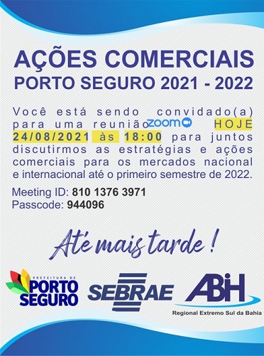 No final da tarde de hoje, 24/08, às 18h, a Secretaria de Cultura e Turismo de Porto Seguro, o Sebrae e a ABIH realizam uma reunião para discutir estratégias e ações de mercado nacional e internacional do município para este e o próximo ano.