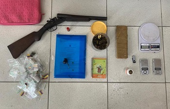 Na manhã do domingo dia 10, após ameaçar populares que contataram a polícia um homem foi preso no Bairro Cambolo. Com ele foram encontrados uma espingarda ROSSI calibre 12, um tablete grande de maconha e três balanças de precisão.