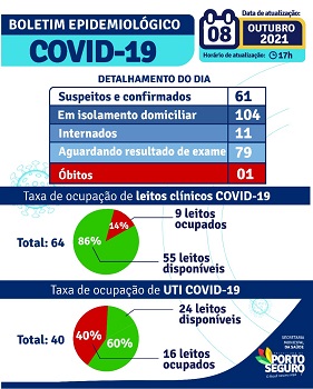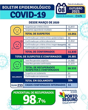 O boletim epidemiológico emitido dia 08/10/21, às 17h, pela Secretaria de Saúde de Porto Seguro, aponta que foram registrados 61 novos casos suspeitos e confirmados para Covid-19. Seguem internadas, da cidade, 11 pessoas. Dos 40 leitos de UTI disponíveis para a região em Porto Seguro e Eunápolis, 24 estão vagos (60%). Dos 64 leitos clínicos, 9 estão ocupados, o que representa 14% do total. 233 pessoas já morreram na cidade em decorrência da doença. O primeiro óbito aconteceu dia 09/05/20, do soldado PM Leonardo Batista da Conceição.